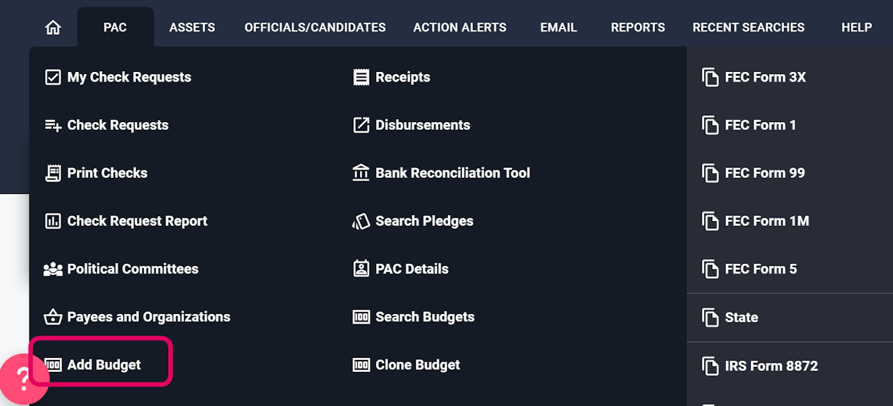 To create a new budget, simply navigate to the PAC menu, then select Budgeting. On the subsequent screen, select the tile to Create Budget.