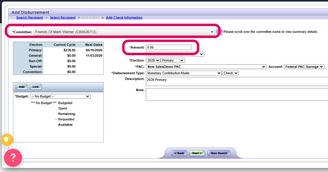 On the Payee screen, you will select the corresponding committee and enter in the amount of the disbursement. Then hit next when all applicable fields have been completed.