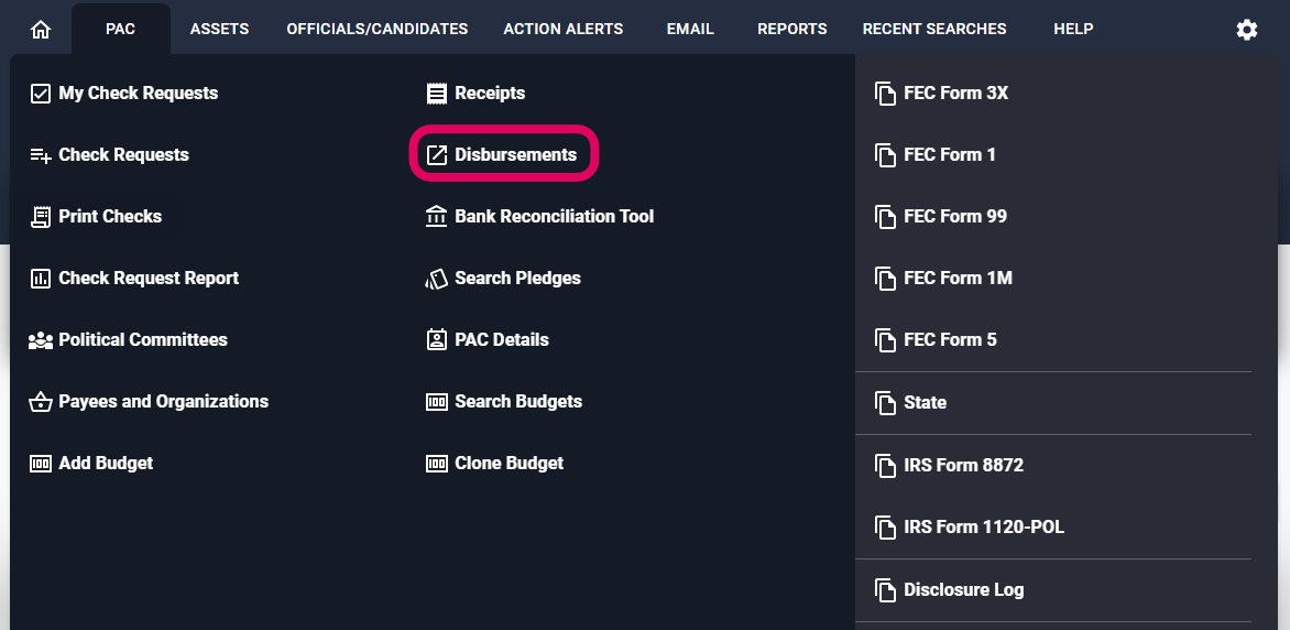 In order to add disbursements, select the PAC menu and select Disbursements.