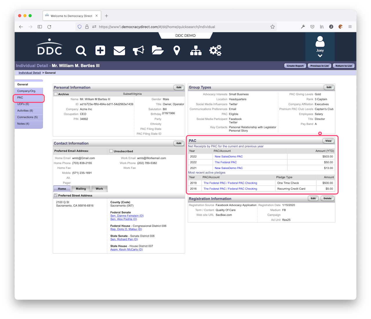 From the individual detail view you can view a summary of PAC history on the Individual detail overview screen. This will show you recent PAC Activity (Pledges, Receipts, and Refunds).